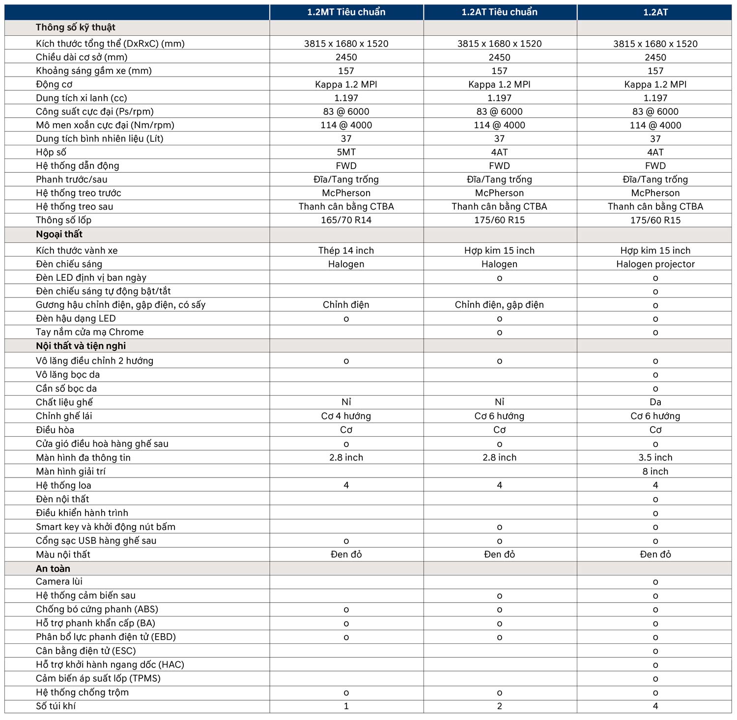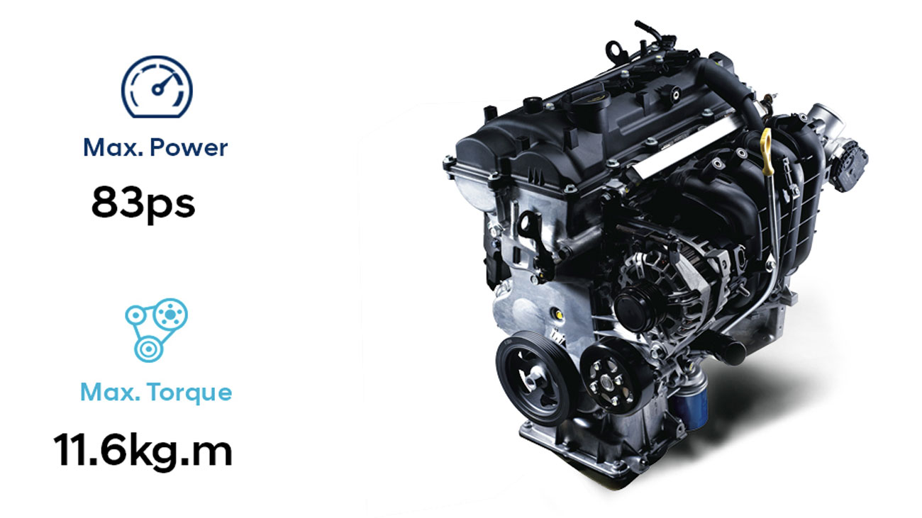 Động cơ 4 xylanh Kappa dung tích 1.2L, đi cùng công nghệ van biến thiên CVVT, cho công suất cực đại 83 mã lực tại 6.000 vòng/phút và moment xoắn 114 Nm tại 4.000 vòng/phút.